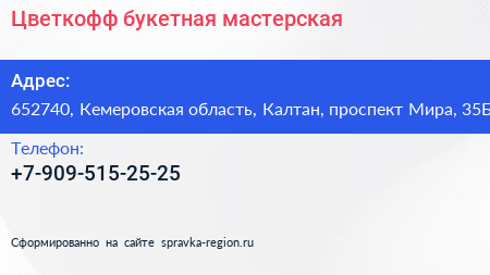 Цветкофф, букетная мастерская по адресу 652740, Кемеровская область, Калтан, проспект Мира, 35Б в дальнейшем Организация, размещена в следующих категориях: