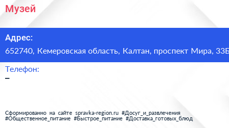 Музей по адресу 652740, Кемеровская область, Калтан, проспект Мира, 33Б в дальнейшем Организация, размещена в следующих категориях: