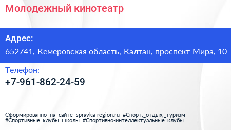 Молодежный, кинотеатр по адресу 652741, Кемеровская область, Калтан, проспект Мира, 10 в дальнейшем Организация, размещена в следующих категориях: