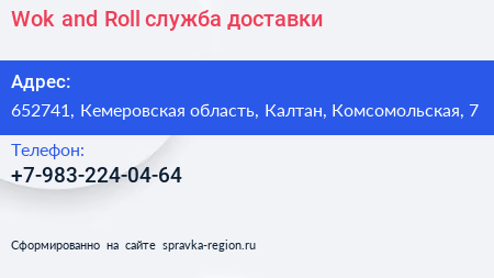 Wok and Roll, служба доставки по адресу 652741, Кемеровская область, Калтан, Комсомольская, 7 в дальнейшем Организация, размещена в следующих категориях: