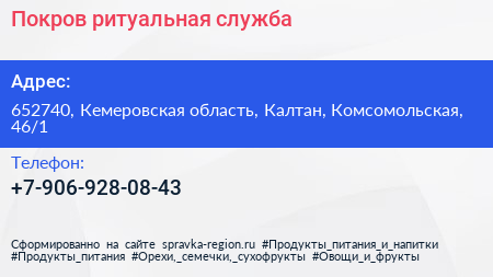 Покров, ритуальная служба по адресу 652740, Кемеровская область, Калтан, Комсомольская, 46/1 в дальнейшем Организация, размещена в следующих категориях: