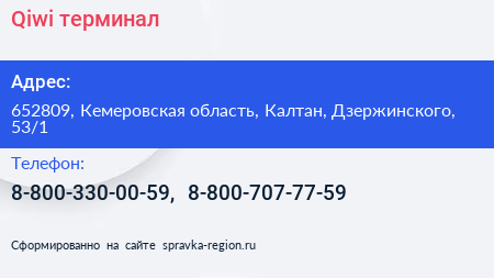 Qiwi, терминал по адресу 652809, Кемеровская область, Калтан, Дзержинского, 53/1 в дальнейшем Организация, размещена в следующих категориях: