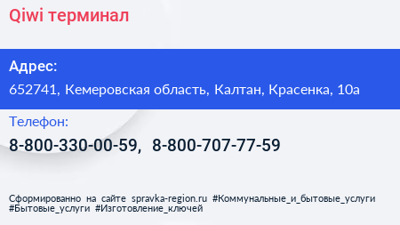 Qiwi, терминал по адресу 652741, Кемеровская область, Калтан, Красенка, 10а в дальнейшем Организация, размещена в следующих категориях: