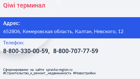 Qiwi, терминал по адресу 652806, Кемеровская область, Калтан, Невского, 12 в дальнейшем Организация, размещена в следующих категориях: