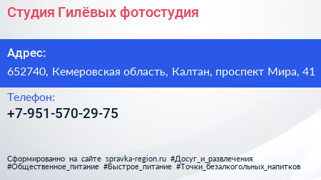 Студия Гилёвых, фотостудия по адресу 652740, Кемеровская область, Калтан, проспект Мира, 41 в дальнейшем Организация, размещена в следующих категориях: