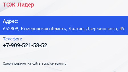 ТСЖ Лидер по адресу 652809, Кемеровская область, Калтан, Дзержинского, 49 в дальнейшем Организация, размещена в следующих категориях: