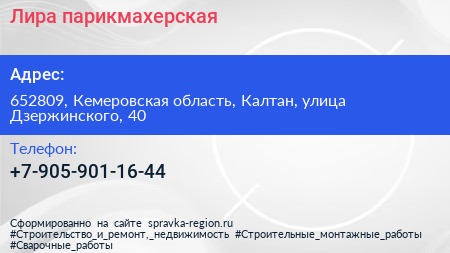 Лира, парикмахерская по адресу 652809, Кемеровская область, Калтан, улица Дзержинского, 40 в дальнейшем Организация, размещена в следующих категориях: