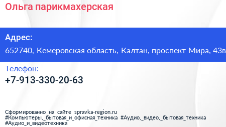 Ольга, парикмахерская по адресу 652740, Кемеровская область, Калтан, проспект Мира, 43в в дальнейшем Организация, размещена в следующих категориях: