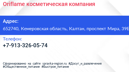 Oriflame, косметическая компания по адресу 652740, Кемеровская область, Калтан, проспект Мира, 39Б в дальнейшем Организация, размещена в следующих категориях: