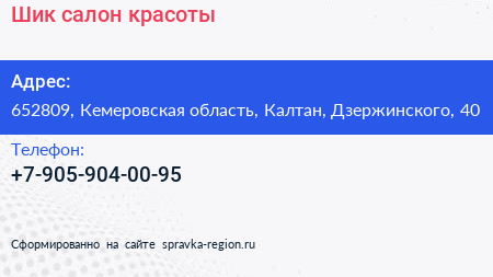 Шик, салон красоты по адресу 652809, Кемеровская область, Калтан, Дзержинского, 40 в дальнейшем Организация, размещена в следующих категориях: