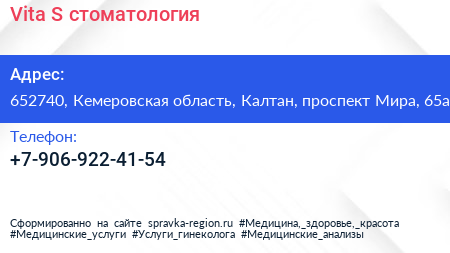 Vita-S, стоматология по адресу 652740, Кемеровская область, Калтан, проспект Мира, 65а в дальнейшем Организация, размещена в следующих категориях: