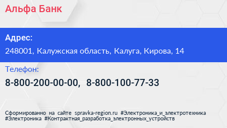 Альфа-Банк по адресу 248001, Калужская область, Калуга, Кирова, 14 в дальнейшем Организация, размещена в следующих категориях: