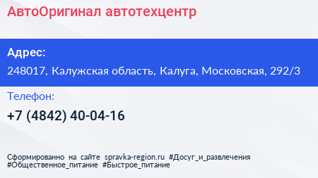 АвтоОригинал, автотехцентр по адресу 248017, Калужская область, Калуга, Московская, 292/3 в дальнейшем Организация, размещена в следующих категориях: