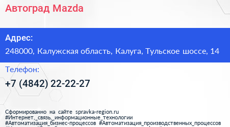 Автоград-Mazda по адресу 248000, Калужская область, Калуга, Тульское шоссе, 14 в дальнейшем Организация, размещена в следующих категориях: