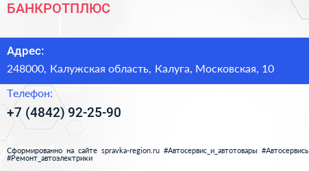 БАНКРОТПЛЮС по адресу 248000, Калужская область, Калуга, Московская, 10 в дальнейшем Организация, размещена в следующих категориях: