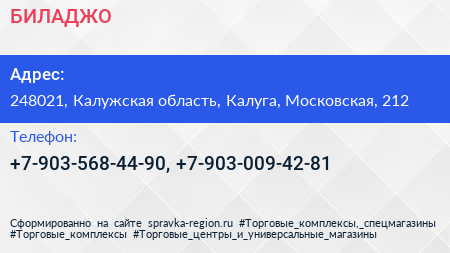 БИЛАДЖО по адресу 248021, Калужская область, Калуга, Московская, 212 в дальнейшем Организация, размещена в следующих категориях: