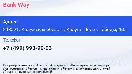 Bank Way по адресу 248021, Калужская область, Калуга, Поле Свободы, 105 в дальнейшем Организация, размещена в следующих категориях: