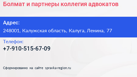 Болмат и партнеры, коллегия адвокатов по адресу 248001, Калужская область, Калуга, Ленина, 77 в дальнейшем Организация, размещена в следующих категориях:
