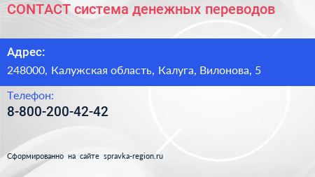 CONTACT, система денежных переводов по адресу 248000, Калужская область, Калуга, Вилонова, 5 в дальнейшем Организация, размещена в следующих категориях: