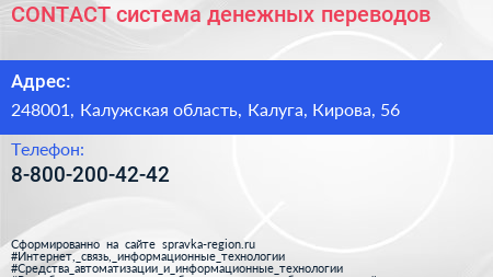 CONTACT, система денежных переводов по адресу 248001, Калужская область, Калуга, Кирова, 56 в дальнейшем Организация, размещена в следующих категориях: