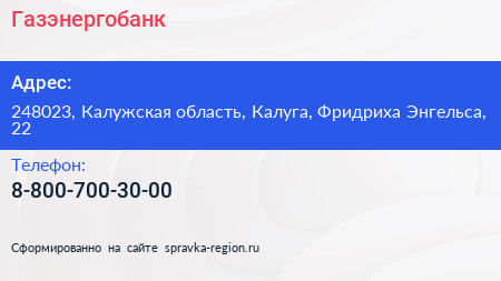 Газэнергобанк по адресу 248023, Калужская область, Калуга, Фридриха Энгельса, 22 в дальнейшем Организация, размещена в следующих категориях: