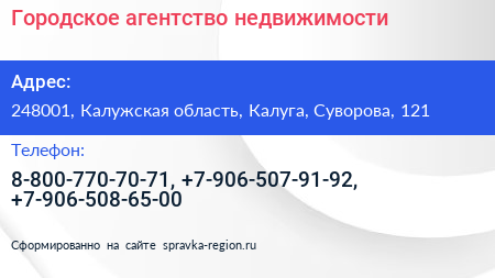 Городское агентство недвижимости по адресу 248001, Калужская область, Калуга, Суворова, 121 в дальнейшем Организация, размещена в следующих категориях: