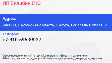 ИП Билибин С.Ю. по адресу 248033, Калужская область, Калуга, Генерала Попова, 2 в дальнейшем Организация, размещена в следующих категориях:
