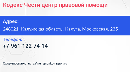 Кодекс Чести, центр правовой помощи по адресу 248021, Калужская область, Калуга, Московская, 235 в дальнейшем Организация, размещена в следующих категориях: