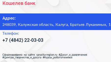 Кошелев-банк по адресу 248039, Калужская область, Калуга, Братьев Луканиных, 1 в дальнейшем Организация, размещена в следующих категориях: