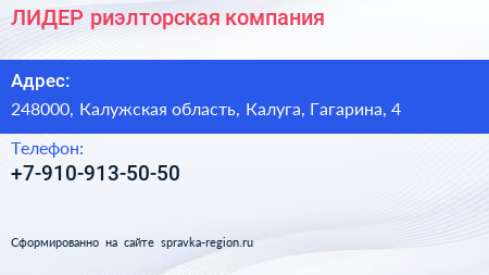 ЛИДЕР, риэлторская компания по адресу 248000, Калужская область, Калуга, Гагарина, 4 в дальнейшем Организация, размещена в следующих категориях: