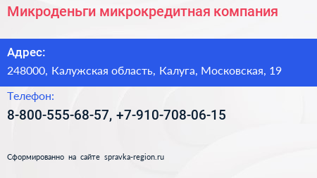 Микроденьги, микрокредитная компания по адресу 248000, Калужская область, Калуга, Московская, 19 в дальнейшем Организация, размещена в следующих категориях: