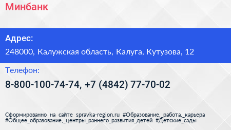 Минбанк по адресу 248000, Калужская область, Калуга, Кутузова, 12 в дальнейшем Организация, размещена в следующих категориях: