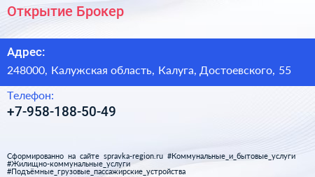Открытие Брокер по адресу 248000, Калужская область, Калуга, Достоевского, 55 в дальнейшем Организация, размещена в следующих категориях: