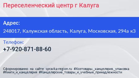 Переселенческий центр, г. Калуга по адресу 248017, Калужская область, Калуга, Московская, 294а к3 в дальнейшем Организация, размещена в следующих категориях: