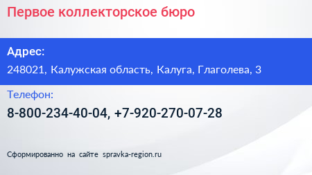 Первое коллекторское бюро по адресу 248021, Калужская область, Калуга, Глаголева, 3 в дальнейшем Организация, размещена в следующих категориях: