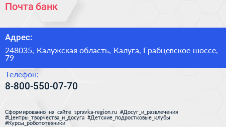 Почта банк по адресу 248035, Калужская область, Калуга, Грабцевское шоссе, 79 в дальнейшем Организация, размещена в следующих категориях: