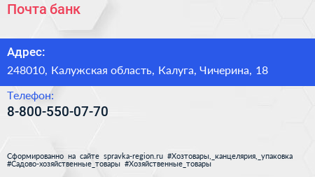 Почта банк по адресу 248010, Калужская область, Калуга, Чичерина, 18 в дальнейшем Организация, размещена в следующих категориях: