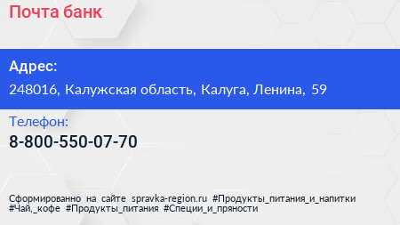 Почта банк по адресу 248016, Калужская область, Калуга, Ленина, 59 в дальнейшем Организация, размещена в следующих категориях: