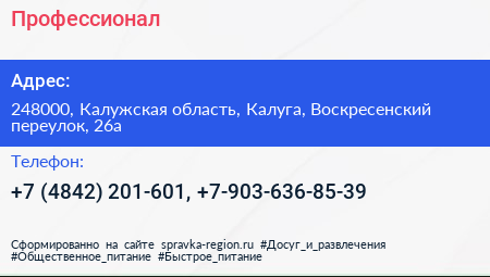 Профессионал по адресу 248000, Калужская область, Калуга, Воскресенский переулок, 26а в дальнейшем Организация, размещена в следующих категориях: