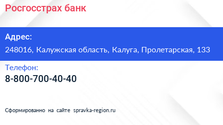 Росгосстрах банк по адресу 248016, Калужская область, Калуга, Пролетарская, 133 в дальнейшем Организация, размещена в следующих категориях: