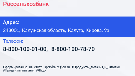 Россельхозбанк по адресу 248001, Калужская область, Калуга, Кирова, 9а в дальнейшем Организация, размещена в следующих категориях: