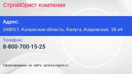СтройЮрист, компания по адресу 248017, Калужская область, Калуга, Азаровская, 18 к4 в дальнейшем Организация, размещена в следующих категориях: