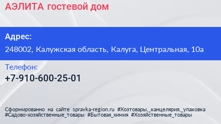 АЭЛИТА, гостевой дом по адресу 248002, Калужская область, Калуга, Центральная, 10а в дальнейшем Организация, размещена в следующих категориях:
