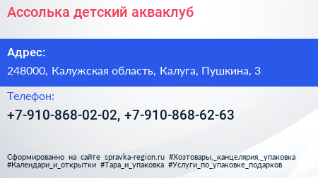 Ассолька, детский акваклуб по адресу 248000, Калужская область, Калуга, Пушкина, 3 в дальнейшем Организация, размещена в следующих категориях: