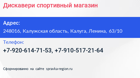 Дискавери, спортивный магазин по адресу 248016, Калужская область, Калуга, Ленина, 63/10 в дальнейшем Организация, размещена в следующих категориях: