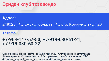 Эридан, клуб тхэквондо по адресу 248025, Калужская область, Калуга, Коммунальная, 20 в дальнейшем Организация, размещена в следующих категориях: