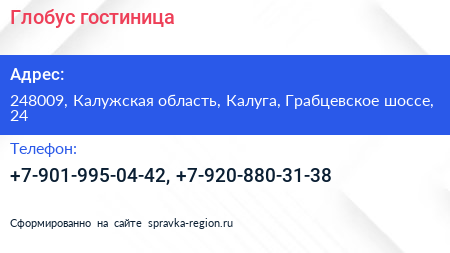 Глобус, гостиница по адресу 248009, Калужская область, Калуга, Грабцевское шоссе, 24 в дальнейшем Организация, размещена в следующих категориях: