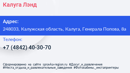 Калуга-Лэнд по адресу 248033, Калужская область, Калуга, Генерала Попова, 8а в дальнейшем Организация, размещена в следующих категориях: