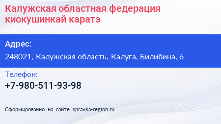 Калужская областная федерация киокушинкай каратэ по адресу 248021, Калужская область, Калуга, Билибина, 6 в дальнейшем Организация, размещена в следующих категориях: