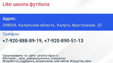 Like, школа футбола по адресу 248018, Калужская область, Калуга, Хрустальная, 22 в дальнейшем Организация, размещена в следующих категориях: